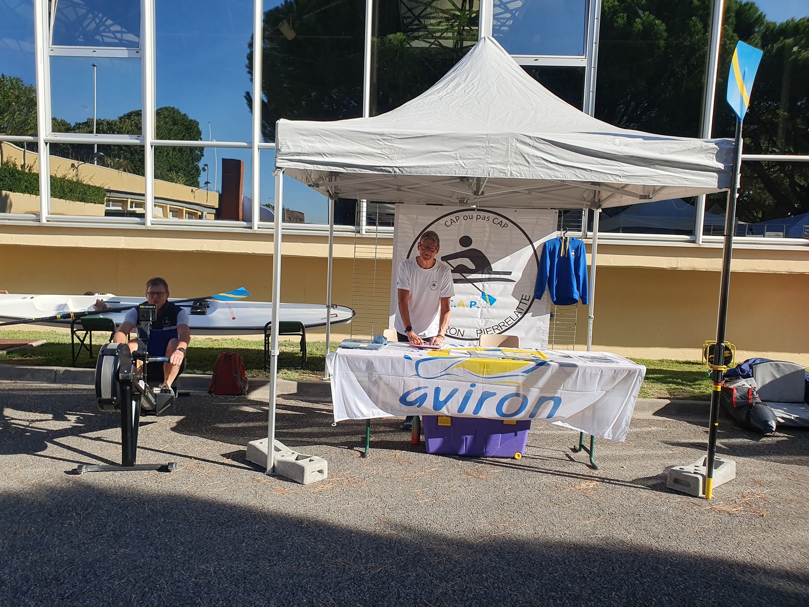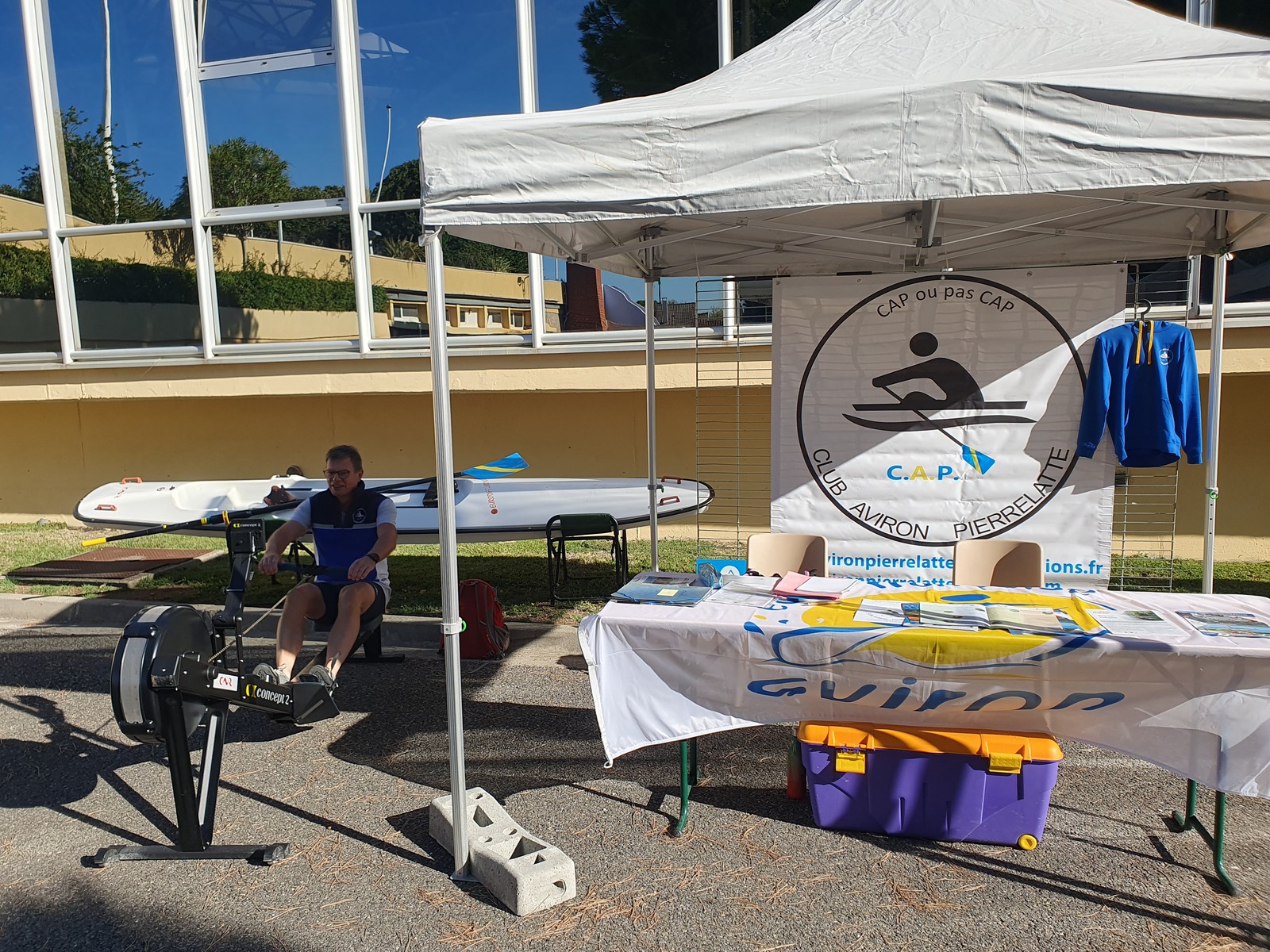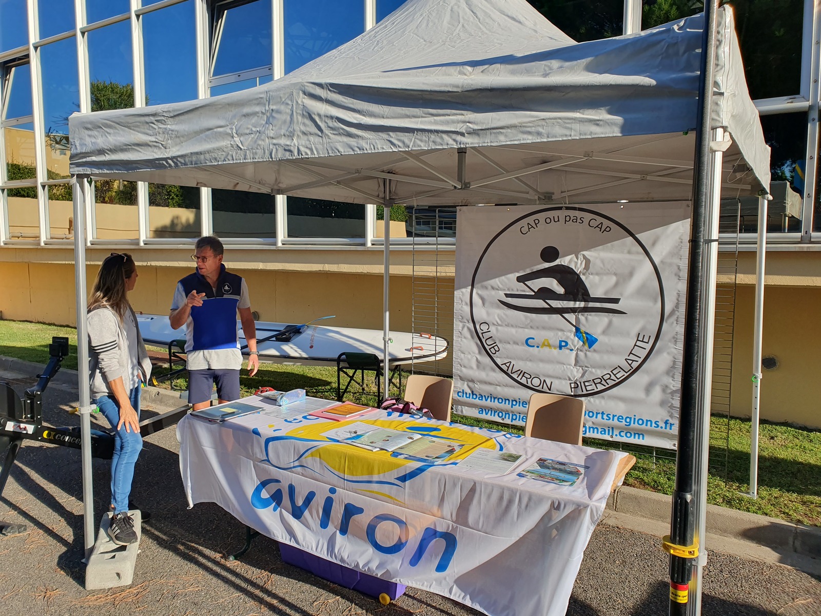 Cette année nous avions un stand bien situé, avec de la place pour exposer une planche à ramer et des avirons. De plus nous avions la nouvelle bâche de communication.